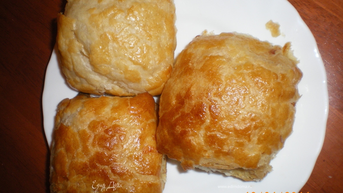 - Шаг 5Вариант 1: Слоеное тесто разрезать на небольшие квадратики. На середину выложить обжаренное куриное филе а сверху начинку из сыра, сверху положить маленький кусочек сливочного масла. Вариант 2: Слоеное тесто разрезать на небольшие квадратики. На середину выложить ветчину, перец, сыр