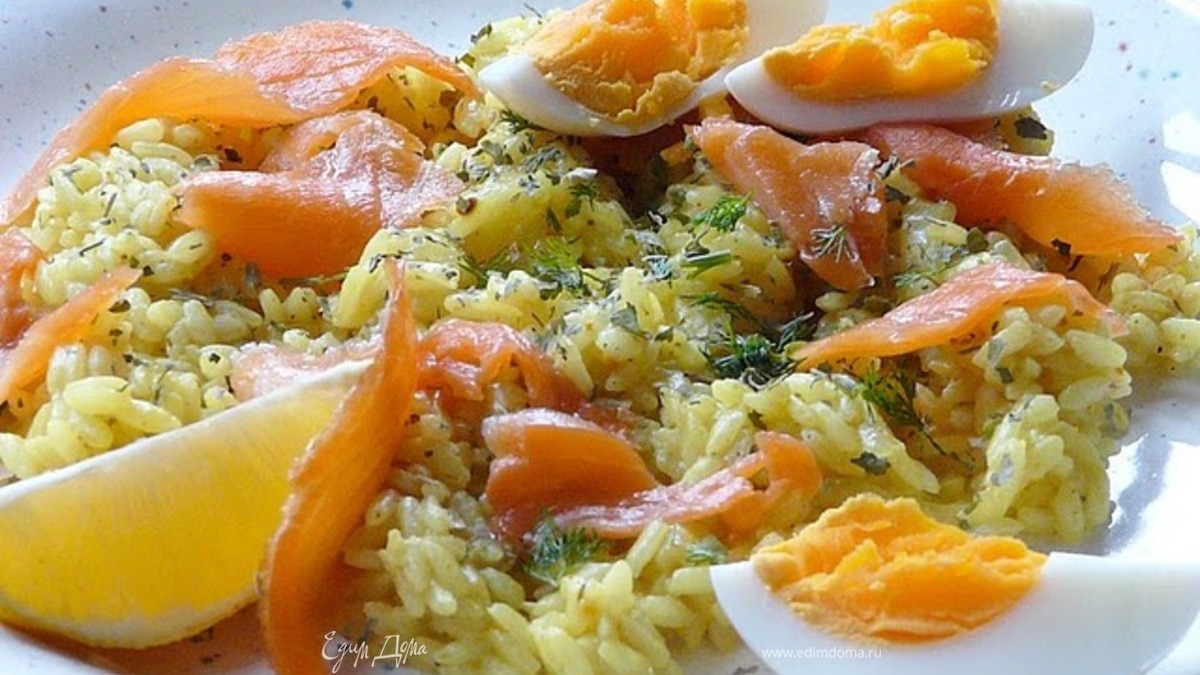 - Шаг 1Закарамелизировать лук на сливочном масле несколько минут, добавить карри, рис и залить бульоном. Протушить минут 15 до готовности. По 2 тарелкам разложить рис, порвать руками лосось на полоски, посыпать зеленью, добавить четвертинки яйца и лимон.