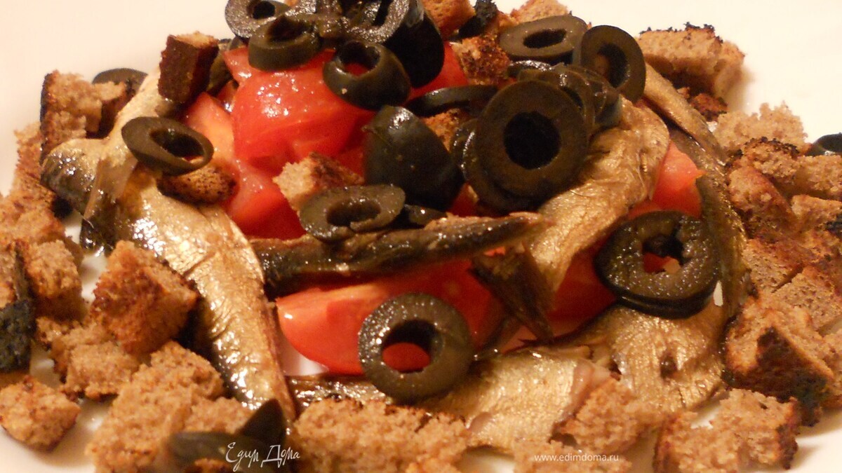 - Шаг 1Хлеб нарезать на небольшие кусочки, обжарить на сухой сковороде до желаемого результата. Помидоры, маслины нарезать, слить лишнее масло из рыбы. Выложить все ингредиенты на тарелку, подавать! П.С. Вторая фотография была сделана осенью, тогда использовал еще сладкий перец.