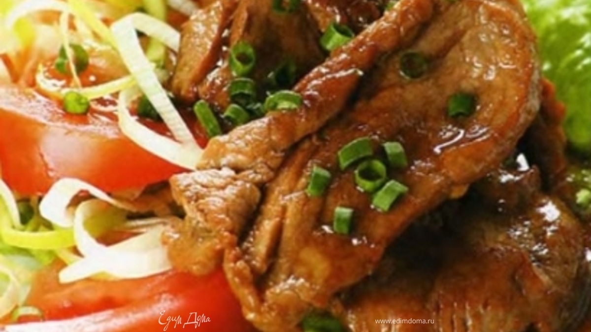 - Шаг 1Листья салата промыть, обсушить, уложить на тарелки. Сверху выложить кусочки свинины. Посыпать колечками лука-порея, полить соусом, образовавшимся при жаренье, свинина с овощами в имбирном маринаде готова