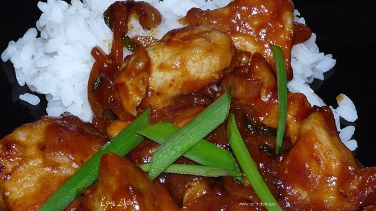 Соединить соевый соус, перец, соль и крахмал с 1-2 ст.л. воды и положить в эту смесь мясо. Оставить на 30 мин. В воке или сковороде обжарить мясо на растительном масле до золотистого цвета, теперь добавить лук. Пару минут протушить и влить смесь кетчупа с патокой/hoisin и чили. Прогреть минуту и подавать.