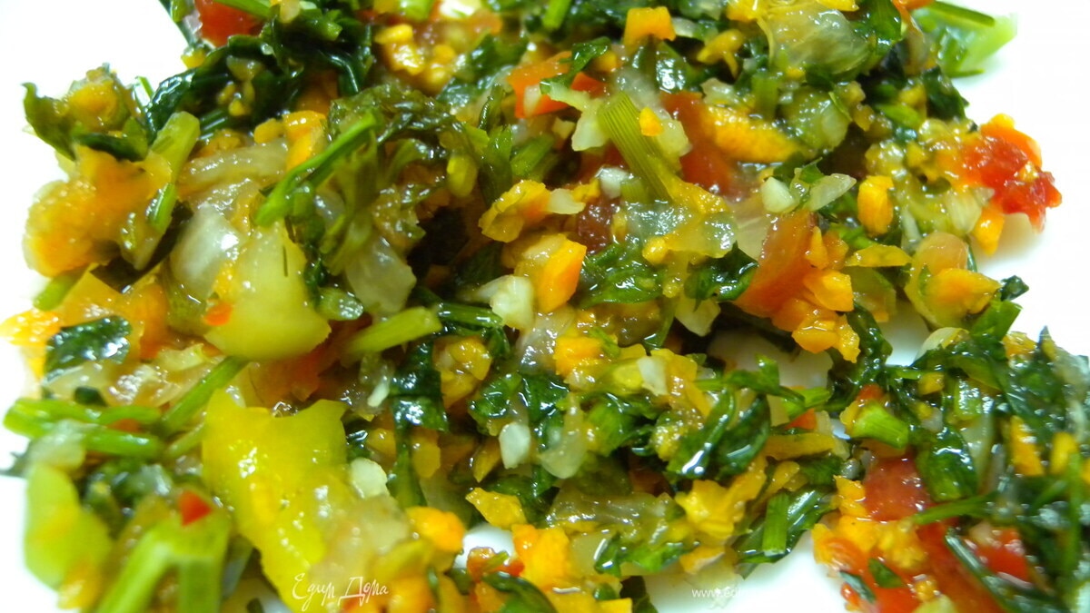 Все овощи вымыть, очистить, нарезать очень мелко, засыпать солью. Перец, помидор и лук я нарезаю ножом, а морковь предпочитаю измельчать блендером или пропускать через мясорубку. Дать немного постоять, чтобы образовался сок. - Шаг 2Разложить по банкам. Хранить в холодильнике или погребе. Кипятить заготовку не нужно.