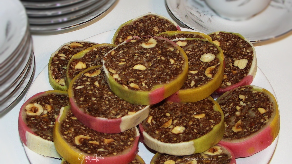 Взять бамбуковый коврик и застелить его пищевой плёнкой.Выложить на него ореховую массу и аккуратно свернуть в цилиндрик.Убрать на пару часов в морозилку. - Шаг 2