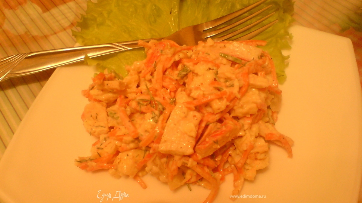 - Шаг 1яйца взбить и сделать омлет без молока.свернуть его в рулет и нарезать крабовое мясо тоже нарезать полосками,морковь по корейски порезать на меньшие полоски,лук обжарить на сливочном масле порезав его полукольцами.все ингредиенты соединить и добавить сметану с майонезом.