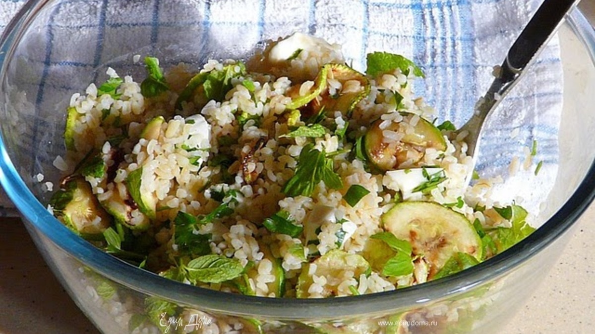 Отварить крупу в воде или овощном бульоне. Тонко нарезать кабачок и на гриле поджарить с обеих сторон по пару минут, побрызгать оливковым. В салатнице смешать мяту, петрушку, нарезаный сыр, добавить кабачок, лимонный сок, если нужно, еще масла и немного соли.