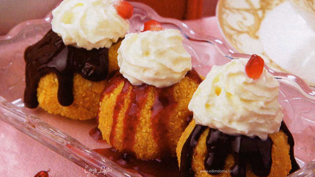 - Шаг 2разделить полученную массу на 4 части, сформовать шарики выложить на тарелку полить ягодным соусом и украсить взбитыми сливками.