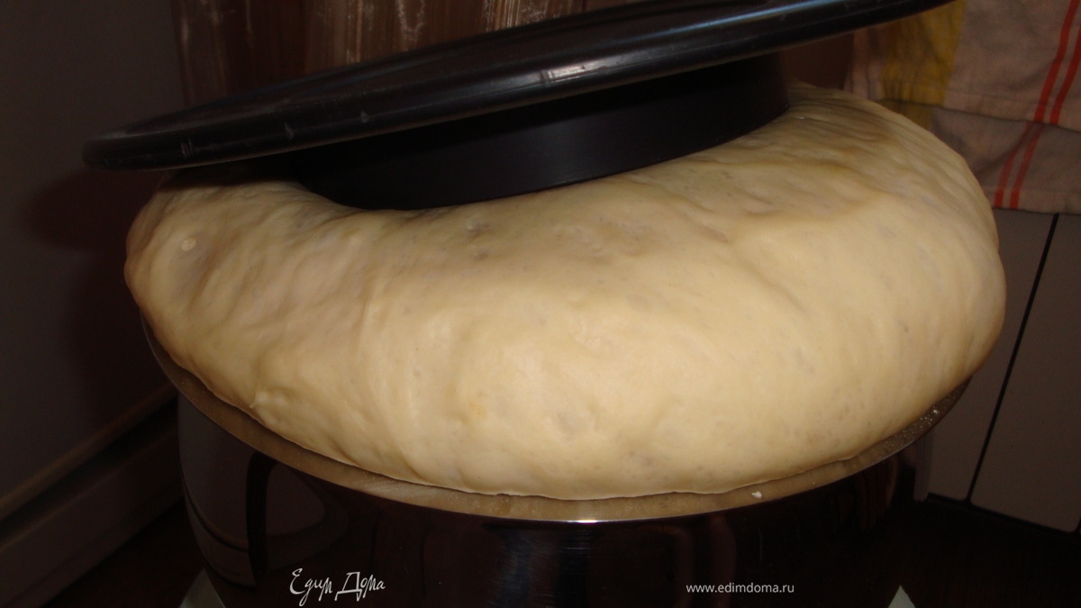 Часа через 1,5-2 проверяем, как тесто подошло (в зависимости от температуры в помещении времени может потребоваться больше или меньше). Однажды произошел такой случай: осенью, когда уже стало холодно, а отопление никак не включали, мне нужно было завести тесто, первый раз оно у меня поднималось часа 4 или 5. На фото на тесте видна окружность - это след от крышки для миски.