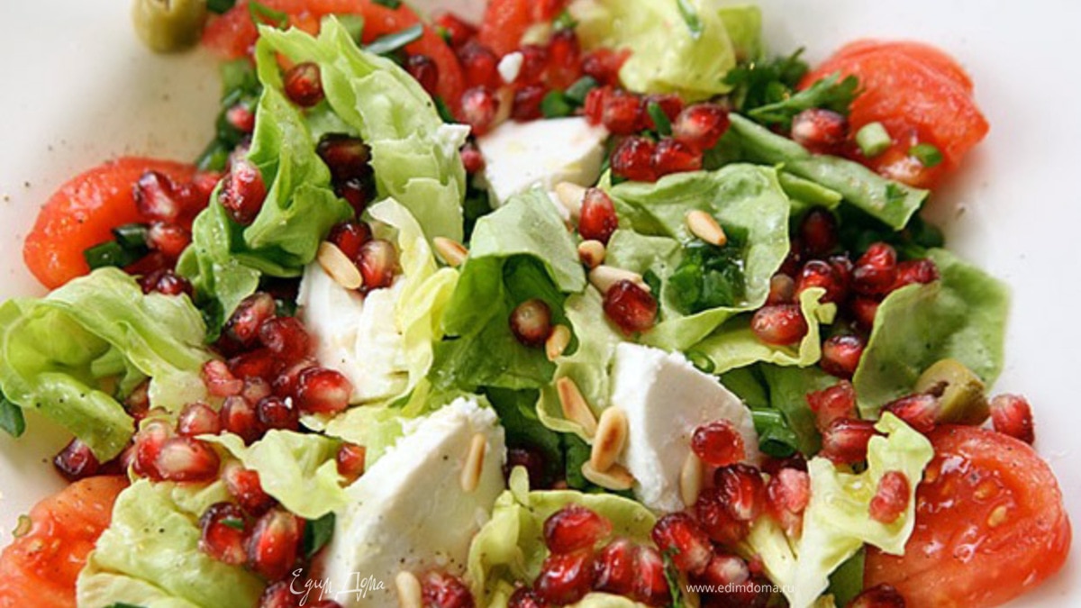 - Шаг 1На листья салата выложить кусочками сыр, нарезанные помидоры, лук. Зерна граната смешать с коричневым сахаром и посыпать ими овощи. Сверху посыпать кедровыми орехами и полить медовым соусом.