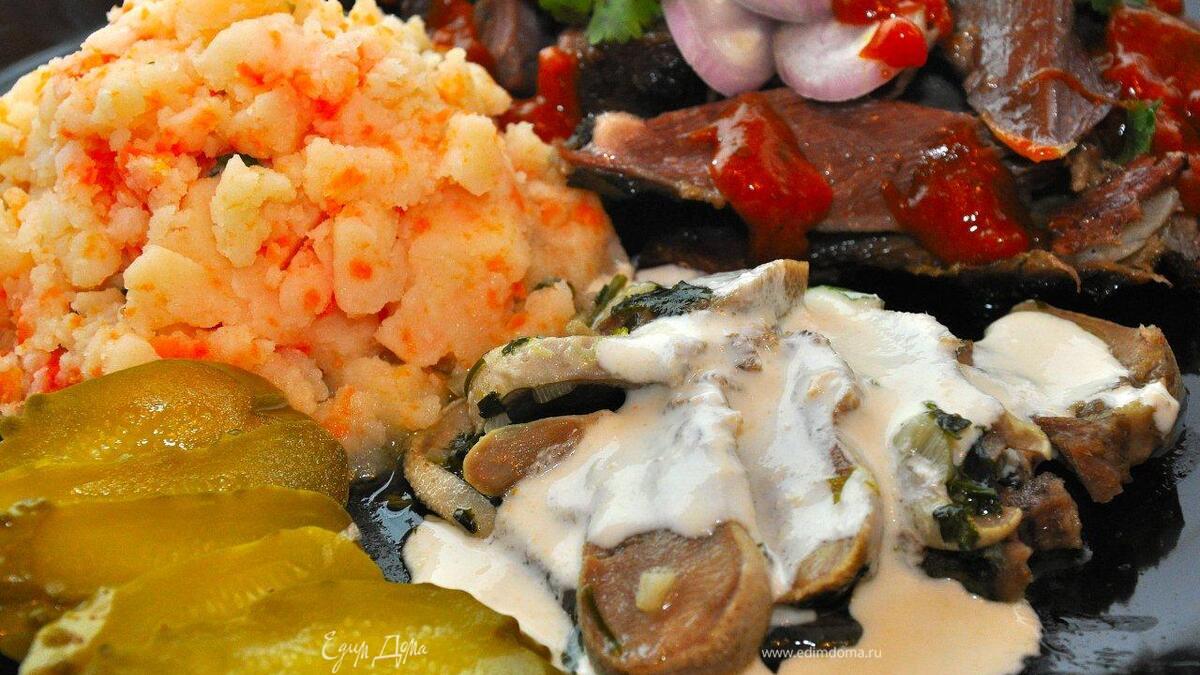 За это время приготовим языки и несложный гарнир. Языки отварить в подсоленной воде с лавровым листом и перцем примерно 1ч20м. Затем вынуть из бульона и нарезать ломтиками. Уложить кусочки языка в сотейник, добавить немного бульона, измельченный чеснок и кинзу. Тушить на медленном огне под крышкой еще минут 30-40. Пока готовится баранина и языки, отварить картофель и морковь, слить воду, хорошо размять овощи со сливочным маслом и зеленью. - Шаг 2