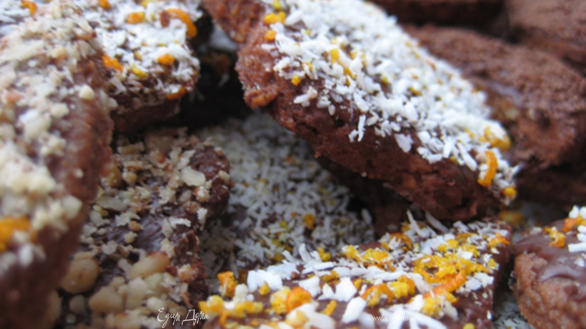 - Шаг 1Шоколад разломать на куски и растопить на поровой бане.В него добавить сливочное мягкое масло,сахар,муку,разрыхлитель,яйцо с желтком взбить и добавить в общую массу.2/3Цедры апельсина и замесить не твёрдое тесто.Вырезать фигурки и запечь.украсить растопленным шоколадом молотыми орехами и цедрой.