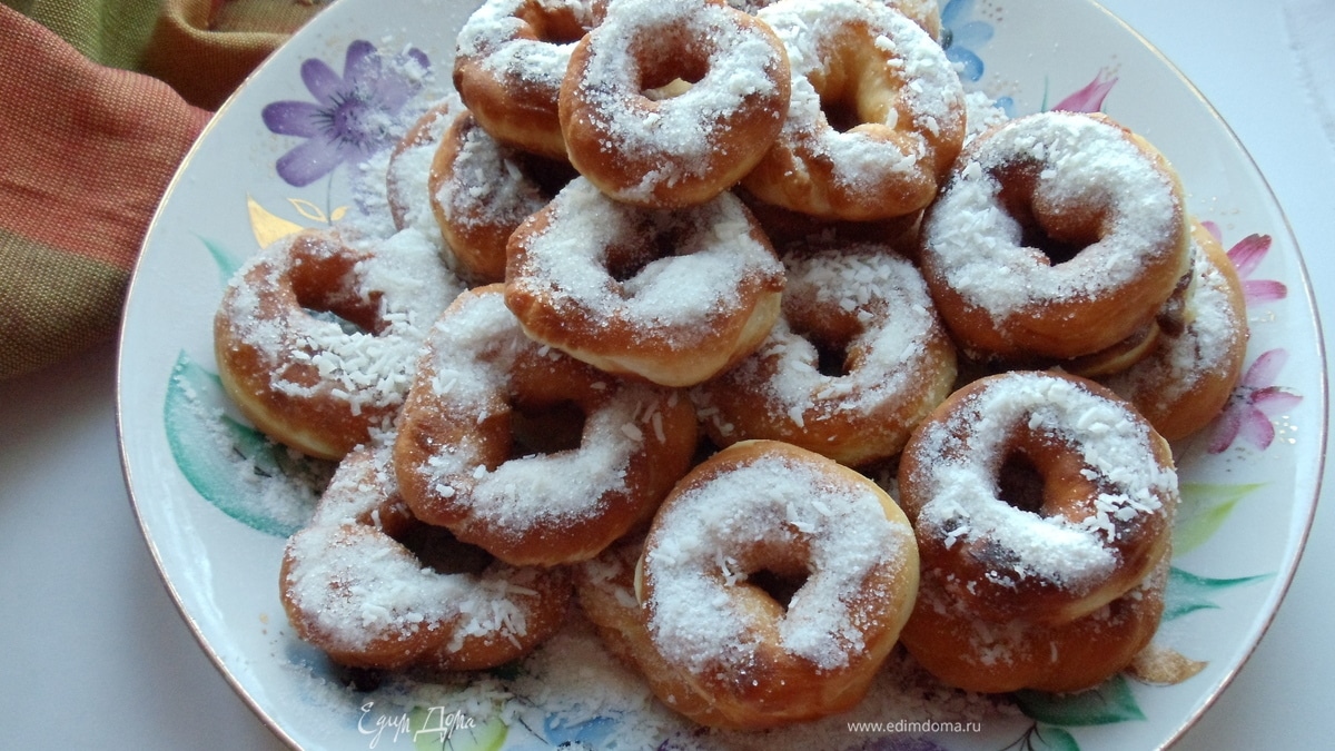 Молоко немного подогреть (чтобы оно было чуть теплое), растворить в нем дрожжи.Добавить 500 г муки, хорошо размешать.Поставить в теплое место. Накрыть полотенцем.Я наливаю в миску теплую воду, в нее ставлю емкость с тестом.Опара должна увеличиться вдвое (на это потребуется около 30 минут).В подошедшую опару добавить сахар, перемешать.Следом добавить размягченное масло, перемешать.Добавить яйца, перемешать. Добавить оставшуюся муку (муки может понадобиться чуть больше или меньше, это зависит от качества муки), замесить тесто. Тесто необходимо хорошо вымесить, оно не должно быть крутым и не должно прилипать к рукам.Снова поставить тесто в теплое место. Дать тесту хорошо подняться (на это потребуется 50-60 минут). Когда тесто подойдет сделать из них кружочки для пончиков, и дать им еще подойти минут 15-20 в теплом месте, и обжариваем в масле я наливаю масло так чтобы пончики скрывало ровно на половину, сразу посыпать сахарной пудрой и кокосовой стружкой. Приятного аппетита!!!