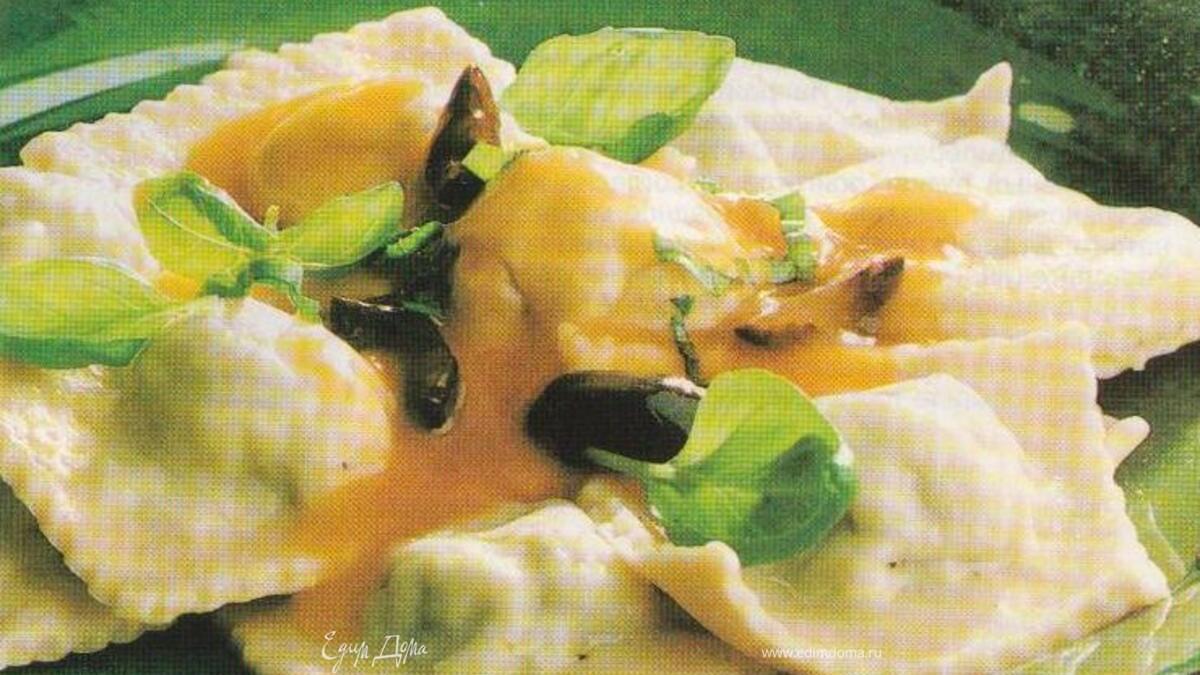 Грибы вымойте, мелко нарежьте и отварите.Шумовкой переложите в другую емкость, влейте 1/2 стакана воды и доведите до кипения.Приправьте, добавьте муку и поварите, чтобы загустить соус.Равиоли полейте грибным соусом и посыпьте базиликом. - Шаг 4