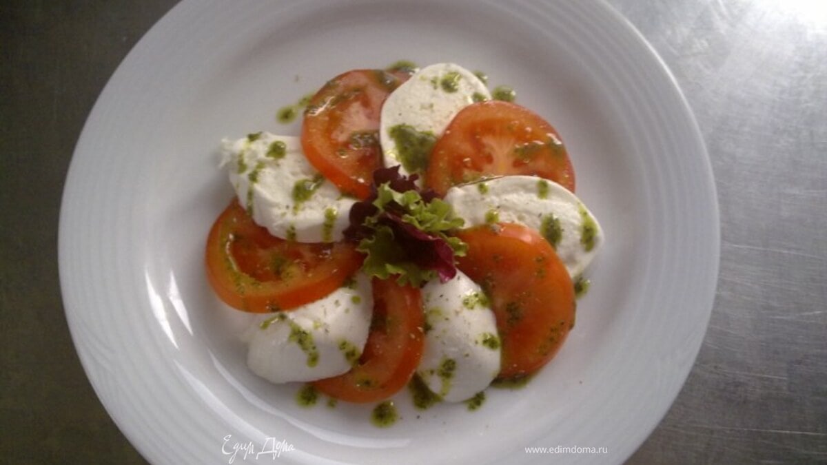 - Шаг 1Выложить на тарелку в виде круга, чередуя, нарезанные кольцами помидор и моцареллу. В центр поместить лист салата. Полить соусом.