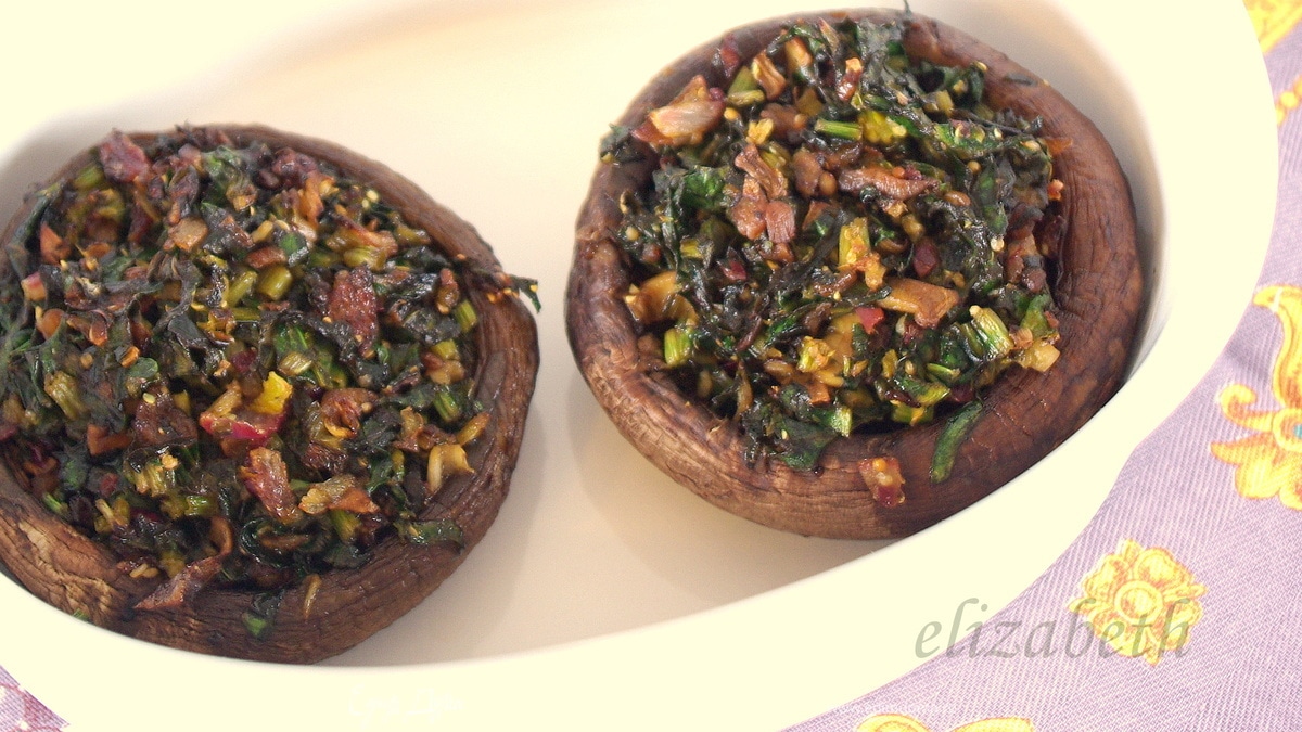 Вырезать из грибов ножки, порубить их не очень мелко. Шляпки слегка обжарить (примерно по 1 минуте с каждой стороны) на разогретом оливковом масле. Выложить в огнеупорную форму или на противень. Лук, рубленные ножки грибов, шпинат обжарить в той же сковороде, где обжаривались грибы. Добавить специи, чеснок и лимонный сок, тщательно перемешать. Шляпки грибов наполнить шпинатом и поставить в разогретую до 200 градусов духовку запекаться. Грибы должны остаться достаточно твердыми.