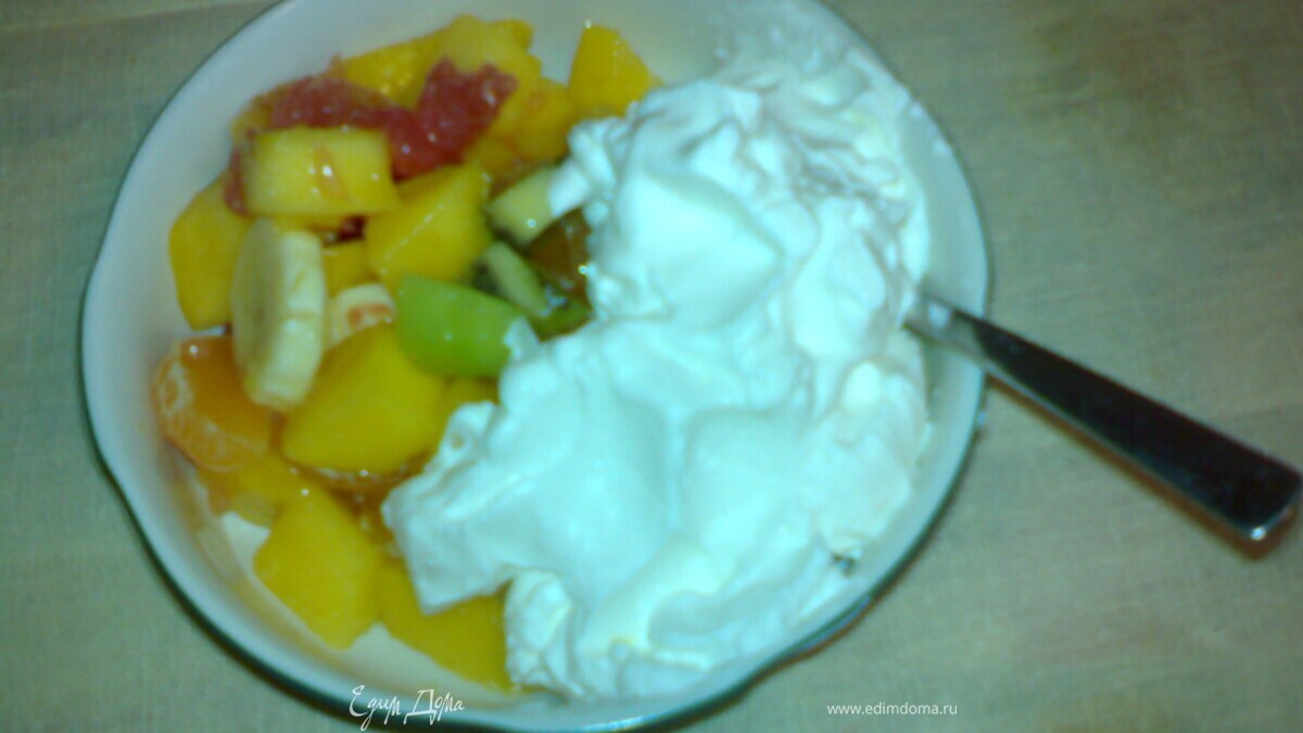 Фрукты произвольно порезать.Сливки взбить,добавив по желанию немного кокосовой стружки.подавать салат со взбитыми сливками.