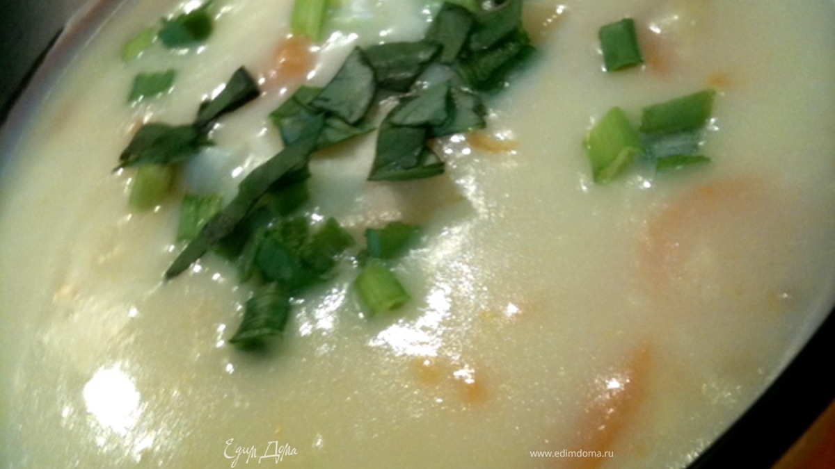 Варим овощной бульон из картофеля, моркови, лука и лаврушки. Убираем лук и лавровый лист. Воду от бульона переливаем в стакан, из картошки и молока делаем густое пюре, добавляя постепенно туда молоко+бульон. Должен быть густой, как сметана.Перекладываем все в кастрюлю, режем отваренную морковь кружочками, разбавляем молоком и бульоном, добавляем сыр и ждем пока он расплавится.Варим минут 5. При подаче в тарелку добавить зелень и 2—3 кусочка сыра (квадратиками).