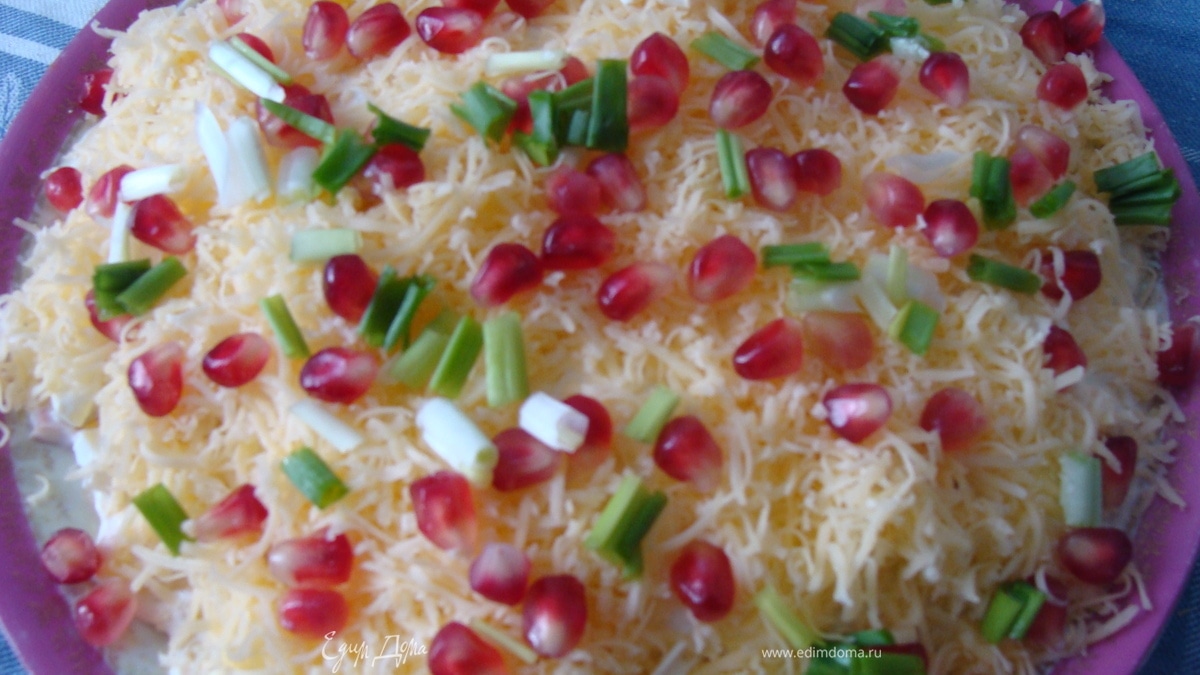 - Шаг 1ингридиенты складываем слоями, каждый слой перемазываем майонезом, кроме последнего, твердого сыра.