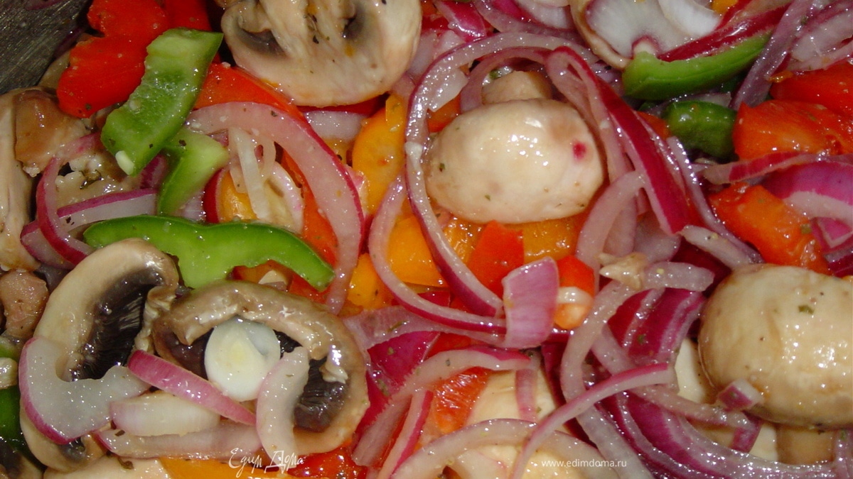 Теперь смешиваем уксус и растительное масло,и заливаем этой смесью грибы,перец и лук.Все перемешиваем и даем промариноваться в течении 0,5 часа,периодически перемешивая. Все,салат готов! - Шаг 4
