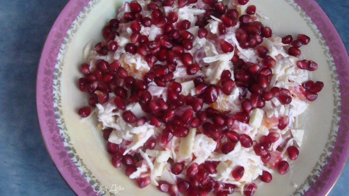 - Шаг 1Сельдерей натереть на терке, яблоко, перец, мандарин нарезаем кубиками, все перемешать с майонезом. Украсить зернами граната