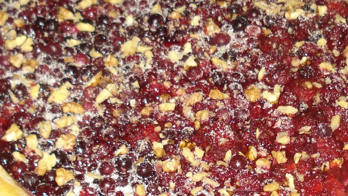 Раскатать тесто по форме противня засыпать ягодами, посыпать сверху песочком и измельченными грецкими орехами. Края теста смазать взбитым яйцом. В духовку до готовности. Готовность теста проверять деревянной шпажкой. Остывший пирог посыпать сахарной пудрой или сахарным песочком. И приятного вечернего чаепития :)
