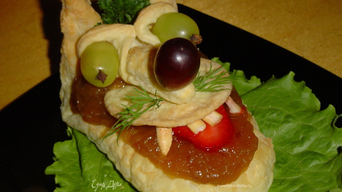 Из винограда делаем глазки и носик.В центр "глазок" вставляем гвоздичку,которая будет имитировать зрачки.Формируем мордочку(как на фото) - Шаг 8