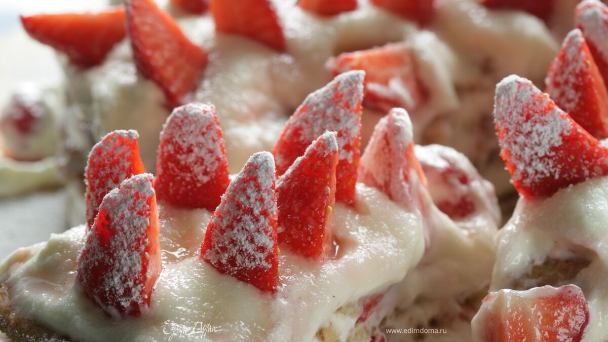 На каждый корж выложить слой взбитых сливок, затем слой клубники. Украсить последний слой взбитых сливок клубничными дольками, поставленными вертикально, и посыпать оставшейся сахарной пудрой.