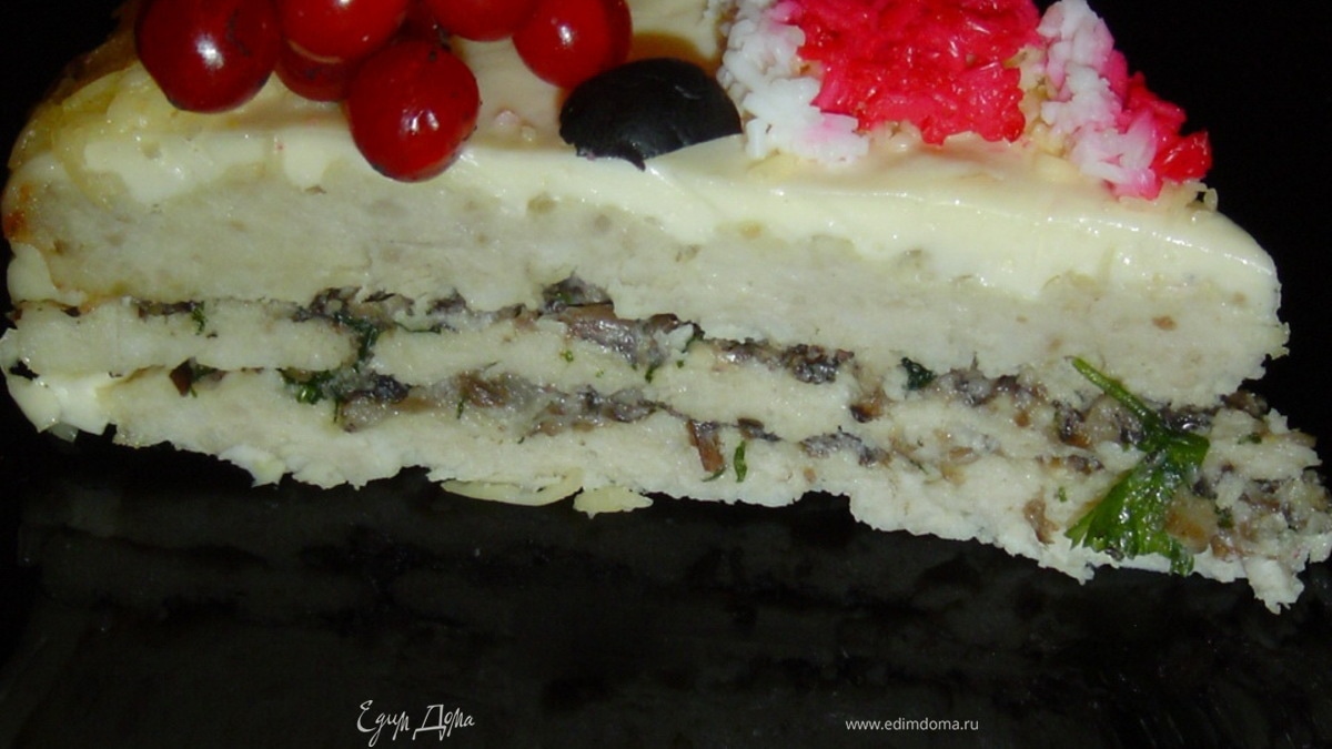 Два коржа смазываем грибным кремом, верхний корж не смазываем. - Шаг 2Для верхнего коржа и боковин готовим сырно-майонезную глазурь. Сливки нагреваем до температуры 70–80°C, добавляем желатин и перемешиваем до его растворения, а затем процеживаем. К сливкам добавляем плавленый сыр, 5 ст. л. майонеза и взбиваем в блендере до однородности. Бока и поверхность торта смазываем полученной глазурью и аккуратно разравниваем. Торт убираем в холодильник и даем ему настояться.