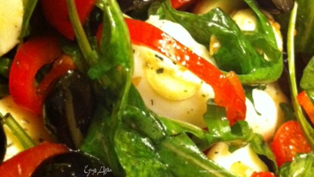 Все достаточно просто, первоначально сделать заправку и дать ей постоять. Порезать помидорки черри и маслины пополам, кольцами или полукольцами сладкий перец. На небольшие кусочки сыр. Добавить руколу. Все заправить и аккуратно перемешать. Украсить сверху перепелиными яичками. Приятного!