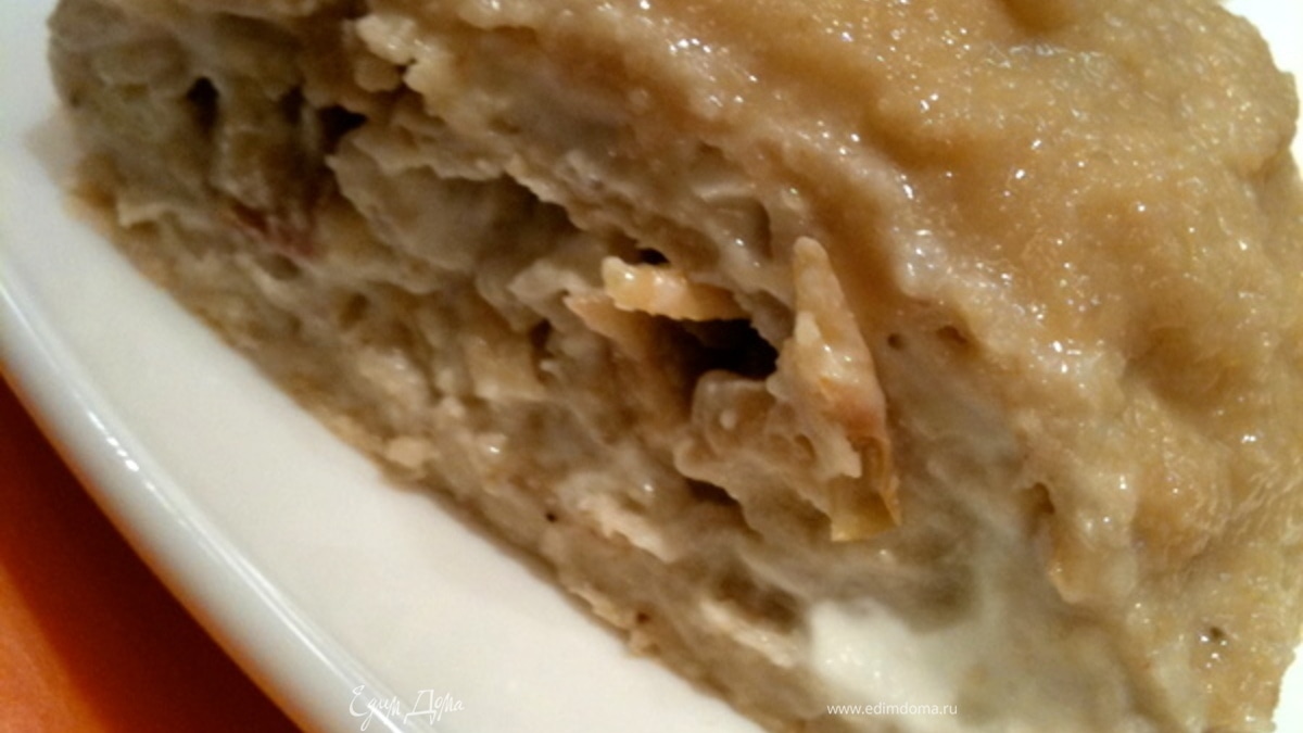 Заливаем овсянку стаканом теплой воды. Даем постоять минут 20—30. Затем заливаем стаканом кефира, перемалываем в блендере, добавляем немного корицы, можно еще изюм, перемешиваем. Выкладываем на противень, застеленный бумагой, тонким слоем, в форме прямоугольника. Выпекать при 200 градусах минут 20. Достать, дать остыть минут 5, не больше — а то не свернется нормально. Мажем получившийся корж творогом, взбитым с кефиром. Выкладываем сверху тертое яблочко, можно изюм еще. Сворачиваем корж в рулет, одновременно отклеивая бумагу. Делаем пюре: яблоко трем, добавляем банан и йогурт, все взбиваем и поливаем наш рулет. Убираем в холодильник на пол часика. Вкусно-вкусно!:))
