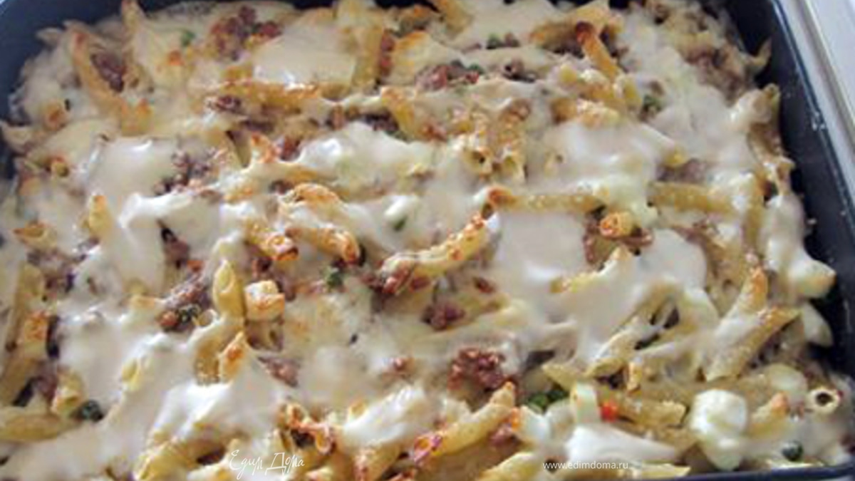 - Шаг 2Макароны отварить до полуготовности. Добавить к ним половину пармезана и моцареллы и залить половиной соуса "бешамель". Перемешать и добавить мясной фарш.