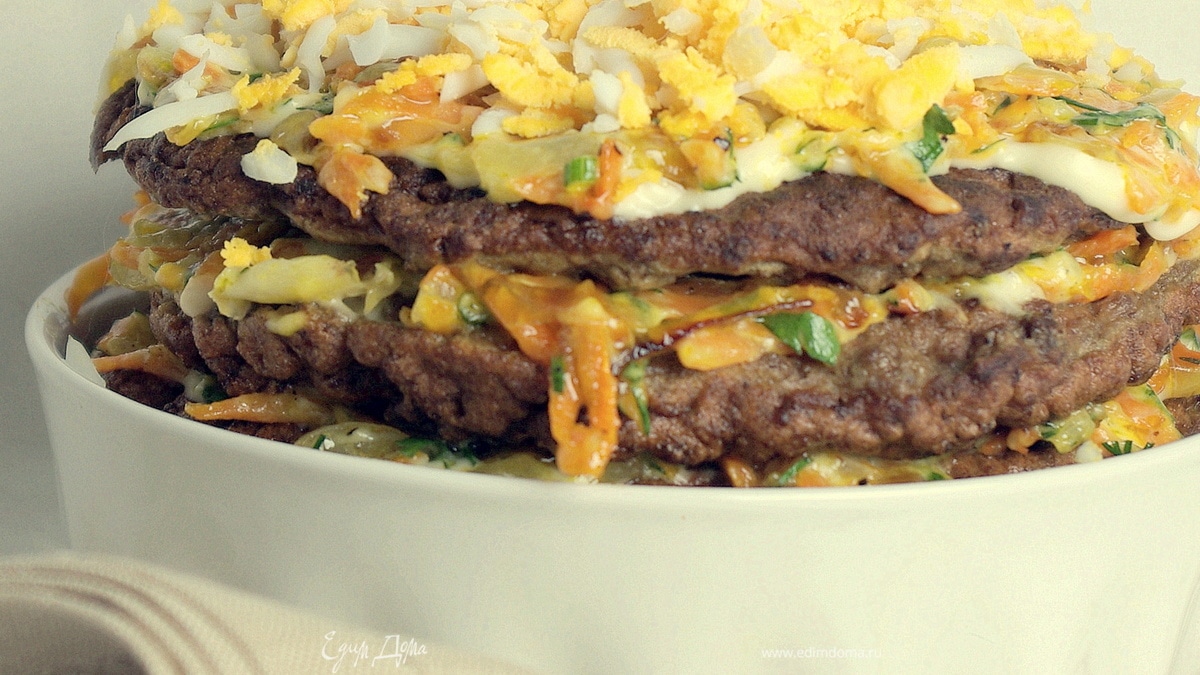 - Шаг 1Печень мелко порезать, измельчить в блендере, добавить туда яйца, молоко, муку и соль, взбить. Из полученной смеси жарить небольшие блинчики - минут по 5 с каждой стороны. Лук и морковь очистить, лук порезать полуколечками, морковь натереть на крупной терке, обжарить. Добавить к овощам раздавленный чеснок, соль, перец, майонез, зелень. (Можно добавить натертый соленый или маринованный огурец). Прослоить печеночные блинчики полученной овощной смесью, украсить натертым на крупной терке яйцом. Дать постоять пропитаться.