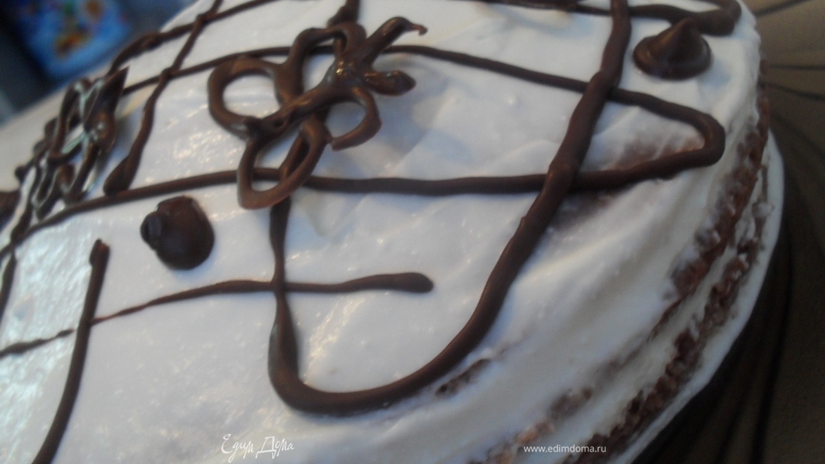 Растопить шоколад, выдавить им фигурки на фольгк или лист пергамента и убрать в холодильник до застывания. Или нанести рисунок сразу на торт.Убрать торт в холодильник для пропитки на несколько часов.