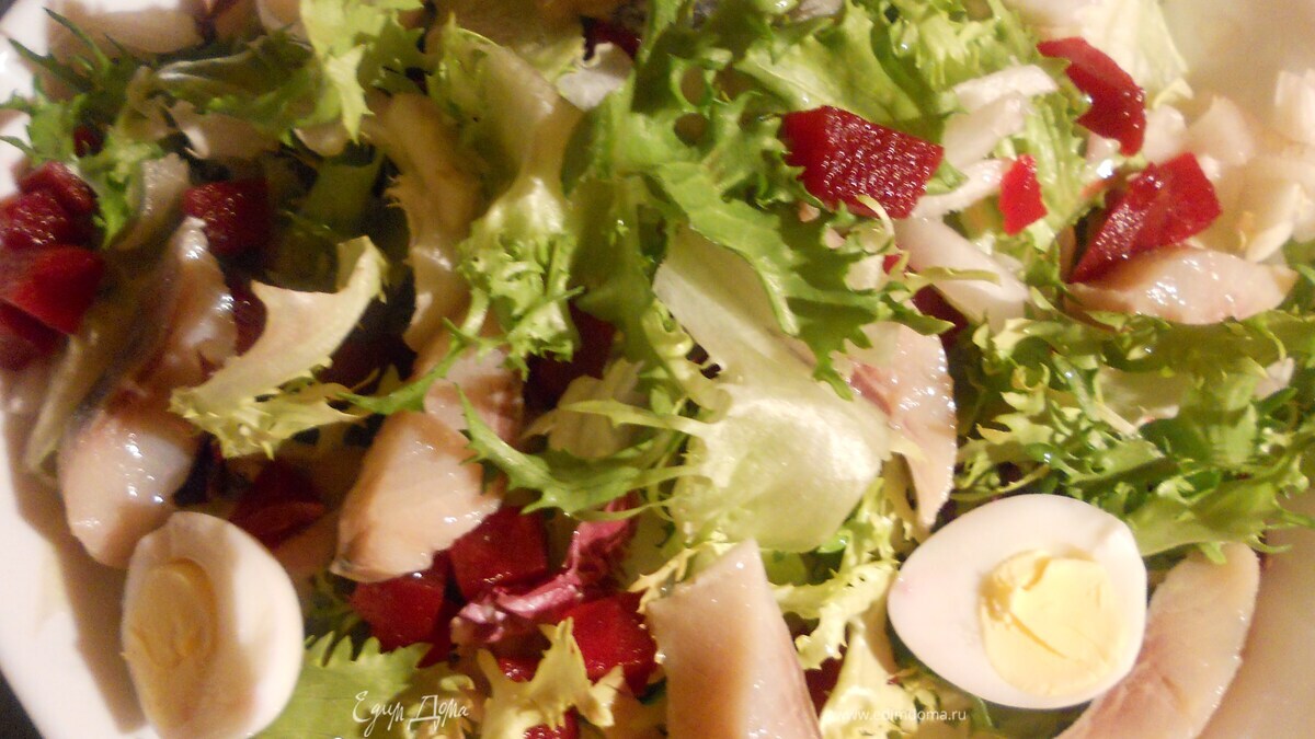 - Шаг 1Свеклу отварить или запечь, очистить, нарезать произвольно. Яйца отварить, нарезать пополам/на четверти. Цикорий разобрать, отобрать листья без горечи, нарезать и соединить с салатными листьями. На тарелку выложить большую горсть салатных листьев, поверх - свеклу и сельдь, украсить яйцами. Салат самодостаточен и сочен, однако можно добавить немного заправки: оливковое масло, дижонская горчица и немного лимонного сока. А можно даже соединить майонез/йогурт с дижонской горчицей, то же будет интересно!