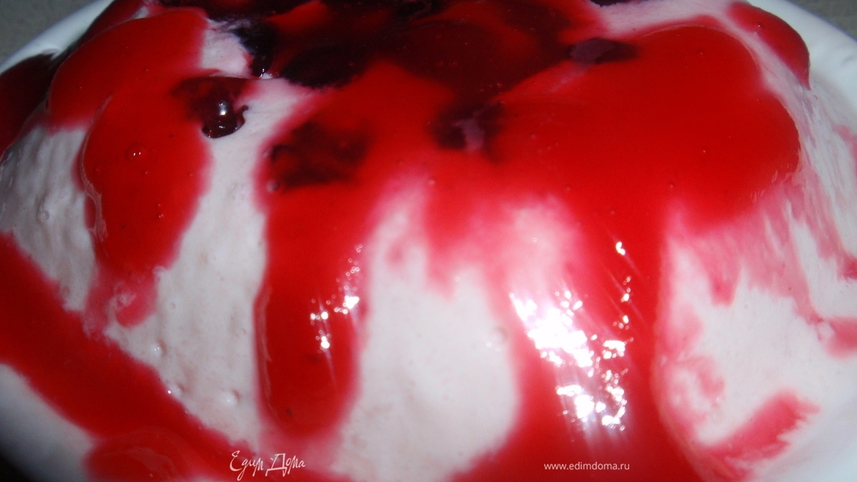 После того как желе остынет, формочки опустить на несколько секунд в горячую воду и выложить желе на блюдо. Украсить сиропом из красной смородины.