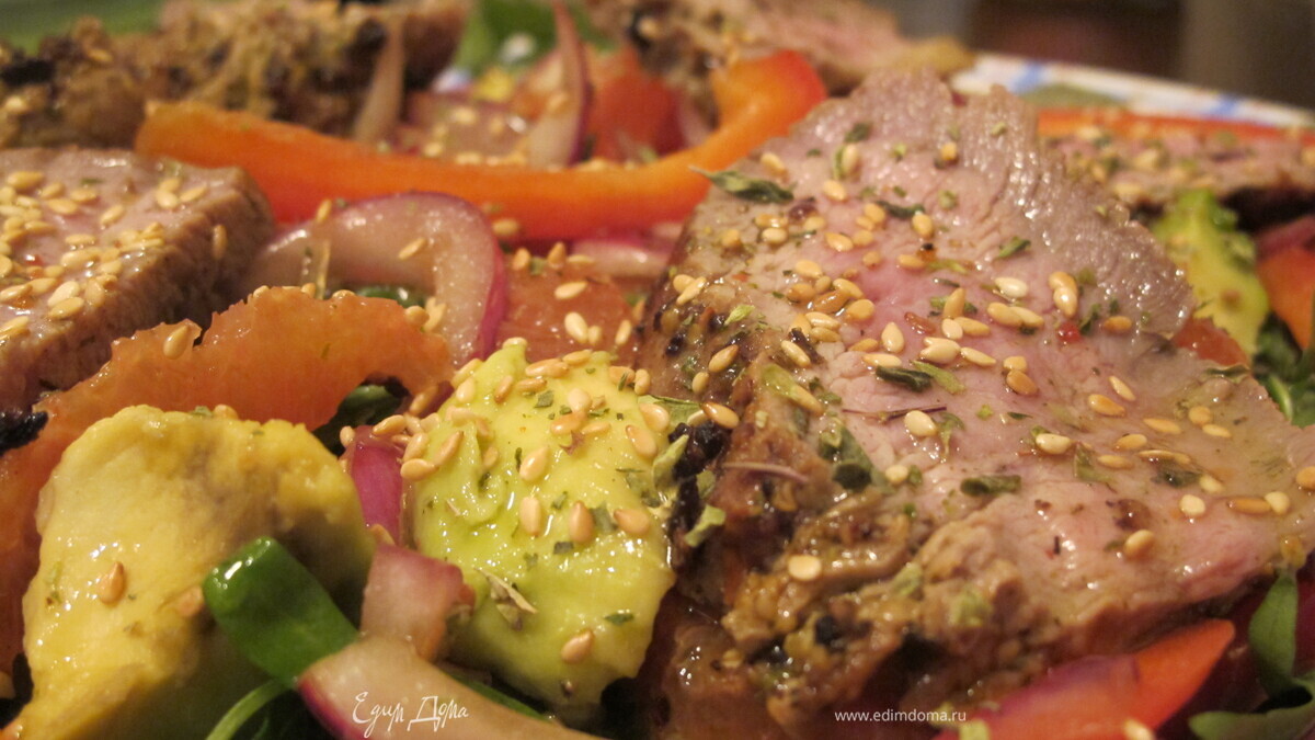 Вырезку обжарить на сковороде ( в моем случае-сковорода-гриль) до любимой вами степеми прожарки (в моей случае-медиум). Нарезать ломтиками и выложить на салат. Подготовить заправку:смешать соль, оливк. масло, сок лайма и итал.травки). Полить салат заправкой, присыпать сухим орегано и кунжутом.