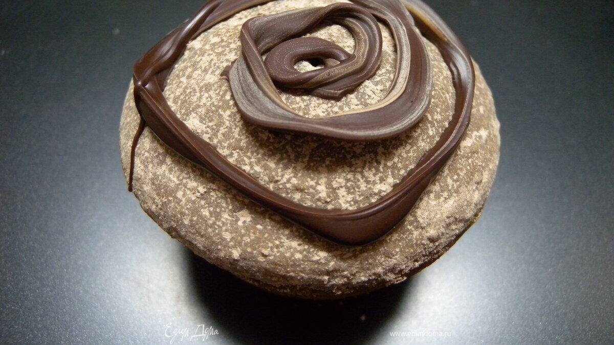 Перевернуть. Ткнуть их "носом" в пудру из какао и сахарной пудры. Полить растопленным (в микроволновке) черным шоколадом.