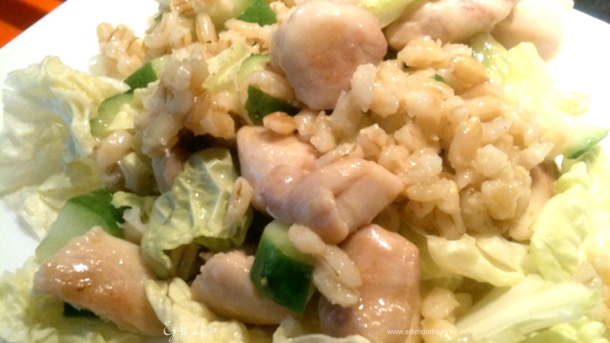 Курицу нарезать, обжарить до готовности. Перловку отварить. Огурчики нарезать, добавить зеленый лук (у меня просто не было), листья салата, курицу, перловку, все перемешать. Делаем заправку: смешиваем все ингредиенты, нагреваем в микроволновке, перемешиваем и заправляем салатик. Необычный приятный вкус!