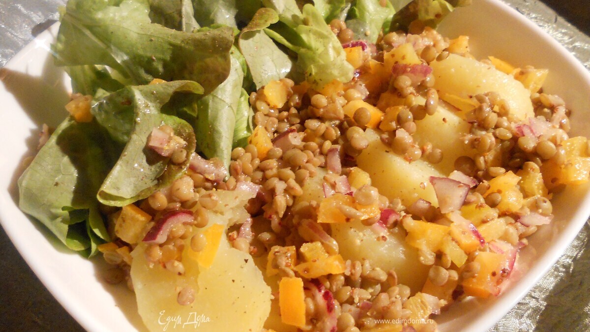 Теплый картофельный салат с чечевицей