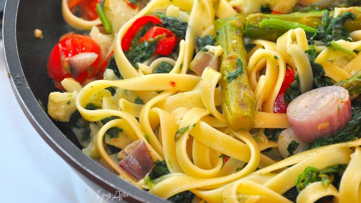 Итак, феттуччине отварить 'аль денте', откинуть в дуршлаг, но оставить примерно пол-литра воды, в которой они варились. На разогретую сковородку добавляем оливковое масло, рубленый чеснок и чили, затем нарезанный сладкий перец и лук шалот. На среднем огне обжариваем пару минут и добавляем цветную капусту и спаржу. Продолжаем готовить овощи, периодически встряхивая их на сковороде. Теперь добавим шпинат и помидорки, и хорошенько приправим все солью и перцем. Тщательно перемешаем и потомим еще пару минут. - Шаг 3