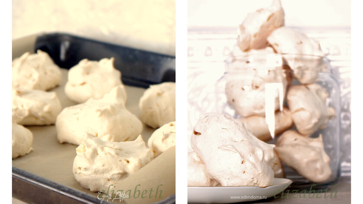 - Шаг 1Белки взбить с сахаром, ванилью и соком лимона в тугую пену. Миндальные лепестки просушить на сухой сковородке. Подмешать во взбитые белки (обязательно предварительно остудить!). Духовку разогреть до 140 градусов. Выложить белково-миндальную смесь на противень, выстеленный кулинарной бумагой. Выпекать меренги в духовке в течение 1 часа (можно слегка убавить нагрев, если они начнут розоветь). Выключить духовку и оставить в ней меренги остывать.