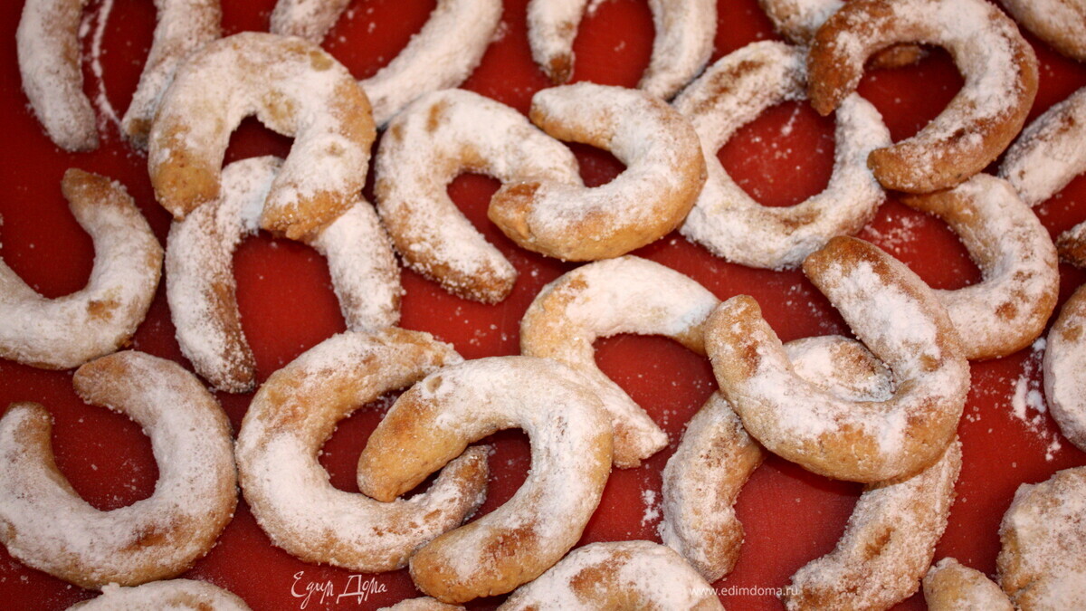 1. Растереть желтки с сахаром 2. Добавить масло, щепотку соли, тщательно перемешать. 3. Добавить молотые орехи и муку, вымесить до гладкого однородного теста. 4. Сформировать тесто в шар, завернуть в пищевую пленку и убрать в холодильник минут на 30. 5. Из теста сформировать полумесяцы 6. Духовку разогреть до 200С и выпекать печенье при 170С около 20 минут. 7. Обвалять еще теплые полумесяцы в сахаре. После остывания посыпать сахарной пудрой. У меня ванильная, получилось очень вкусно и ароматно.