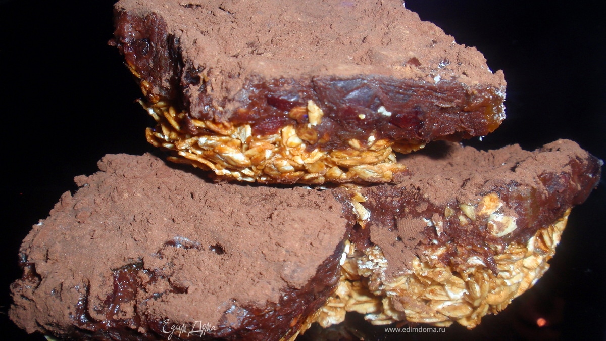 Выкладываем шоколадную массу на овсяные хлопья (остывшие). И ставим в холод. Часа через 1,5-2 можно резать. Посыпать какао. - Шаг 5