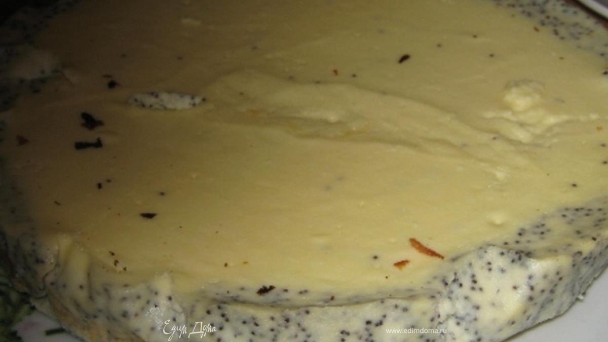 - Шаг 4От получившегося крема отделить 1/3 часть и отложить в отдельную миску. В оставшийся крем добавить мак и аккуратно перемешать. В испеченную песочную основу выложить крем с маком, потом Сверху, в центр выложить отложенную часть крема без мака.