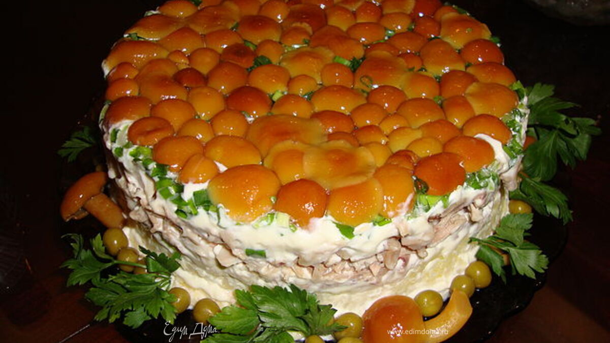 - Шаг 11. На дно пиалы выкладываем грибы шляпками вниз (у меня опята); 2. зелёный лук + укроп ; 3.майонез; 4. мясо курицы (можно другое); 5. майонез; 6. тонкий слой отварного картофеля (на тёрке); 7. майонез; 8. сыр на терке ; 9. майонез. Дать немного настояться в холодильнике, затем перевернуть на блюдо.