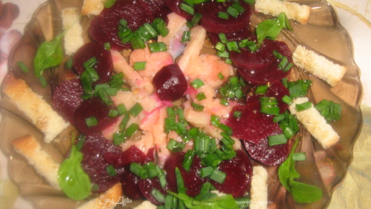- Шаг 1Рыбу нарезать полосками, свеклу кольцами или полукольцами. Выложить на тарелку, по краям разложить сухарики. Я готовлю их сама: поджариваю хлеб в тостере, режу и поливаю частью заправки.