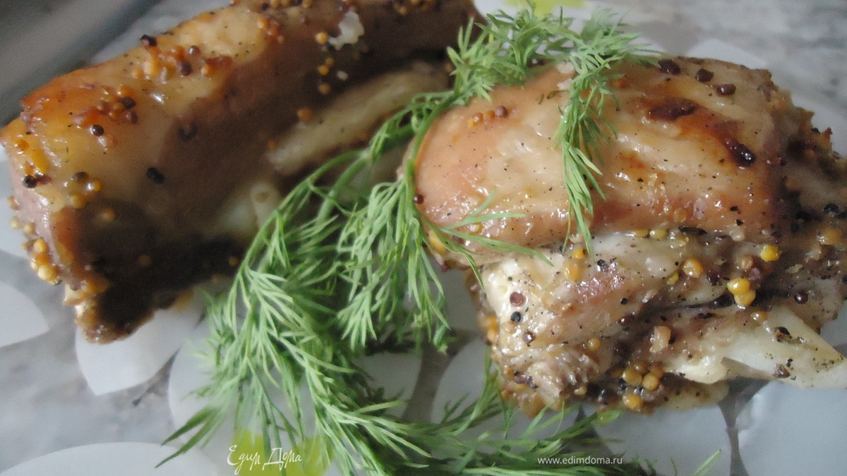 - Шаг 1Грудинку поперчить, посолить. Смазать горчицей в зёрнах (примерно 3 ст.л.), политьсоевым соусом, выдавить чеснок, травки на свой вкус (у меня только орегано). Хорошо перемешать, поставить в холодильник на 2 часа(можно на ночь).