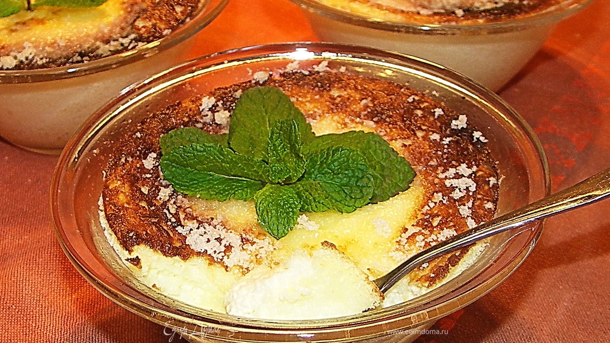 Переложить крем в жаропрочные формочки смазанные сливочным маслом.Поставить формочки в глубокий противень на дне которого расстелить хлопковую салфетку( по совету Nata Ru делаю так,очень удобно,формочки стоят надёжно)Залить противень водой так,чтобы 2/3 формочек были погружены в воду.Отправляем в духовку 170С на 30 мин.В последние 2 мин посыпать пудинги щепоткой сахара и подрумянить по грилем.Десерт хорош как тёплый,так и холодный.Тёплый он невероятно воздушный,словно из пузырьков))А остывший более плотный и более творожный))Украшаем веточками мяты и приятного аппетита! - Шаг 3