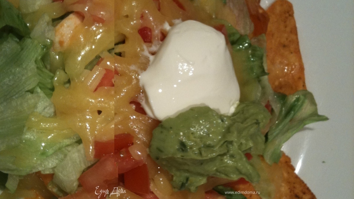 - Шаг 1Берем противень, выкладываем на него чипсы. (Хотя лично я формировала все блюдо сразу на тарелке и в ней же запекала в духовке). Режем курицу на маленькие кусочки (но не слишком мелко, см 3х2). Если изначально курица уже приготовлена на гриле, тогда переходим к следующему этапу, если же нет - обжариваем до готовности на сковороде. Добавляем к курице соус и тушим еще немного. Выкладываем курицу на чипсы. Нарезаем помидоры и капусту. Овощи перекладываем на курицу. Засыпаем сыром. Ставим в духовку на мин.8-10, чтобы только расплавился сыр. Сверху положить немножко (примерно 1 ст.ложку) сметаны и мексиканского соуса из авакадо. Приятного аппетита!