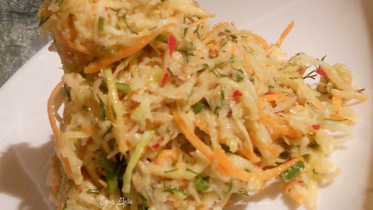 - ПодготовкаОвощи очистить, нашинковать с помощью комбайна (можно использовать различные ножи), зелень мелко нарезать, присоединить к натертым овощам. В большой миске соединить овощи, йогурт (немного, он должен лишь слегка покрывать салат), добавить горчицу, немного оливкового масла. Перемешать и подавать (особо хорошо с теплым хлебом, если есть)!