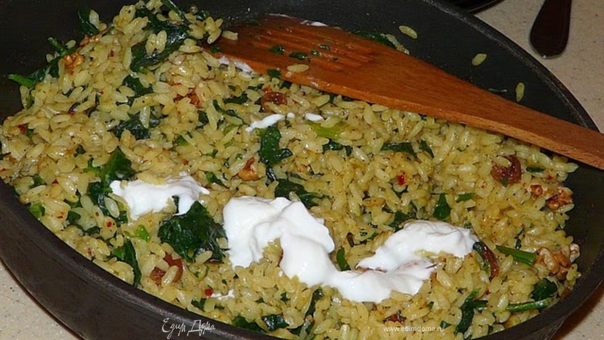 - Шаг 1Подержать чеснок и специи на растительном масле в сковороде 2 минуты, добавить рис и залить водой/бульоном, добавить изюм. 15 минут потушить, положить шпинат, орехи. Перемешать и выключить. Подавать можно с йогуртом.